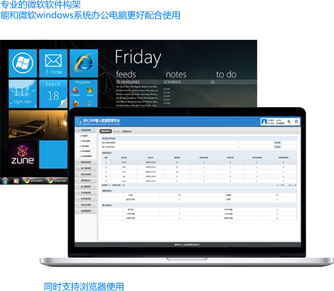 本系统是由来自于深圳华为公司资深研发经理领衔构架,是华为的技术等级。采用的是先进的SilverLight技术,而不是普通的网页技术生搬硬套成软件,专业的软件构架,能和用户办公使用的windows系统办公电脑更好配合使用。