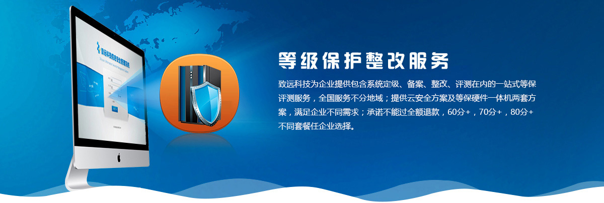 致远等保服务全国不分地域,企业只需提供基本资料,其他事项均由我方一站式负责(定级、备案、技术文案、整改实施、等保评测等)。安全防护方案中,云安全方案或等保硬件一体机两套方案任选,满足大中小型企业不同需求。承诺不通过全额退款,为企业定制70分+,80分+,90分+不同套餐方案,满足企业对安全防护的不同要求。