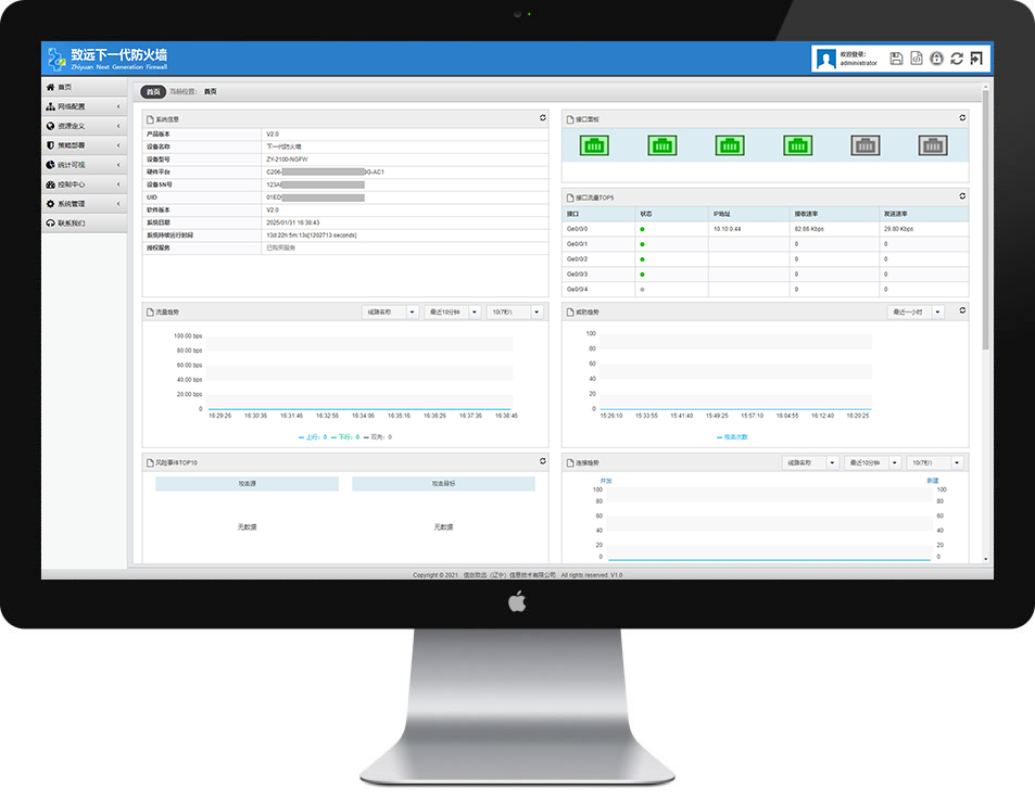 实时图表显示用户连接数、当前会话数、应用使用排名等信息,提供多种统计方式,如基于用户、应用、接口、安全策略等因素进行统计显示并可生成多种报表,可依据五元组、应用协议、时间点/时间段等元素自定义报表内容。 |