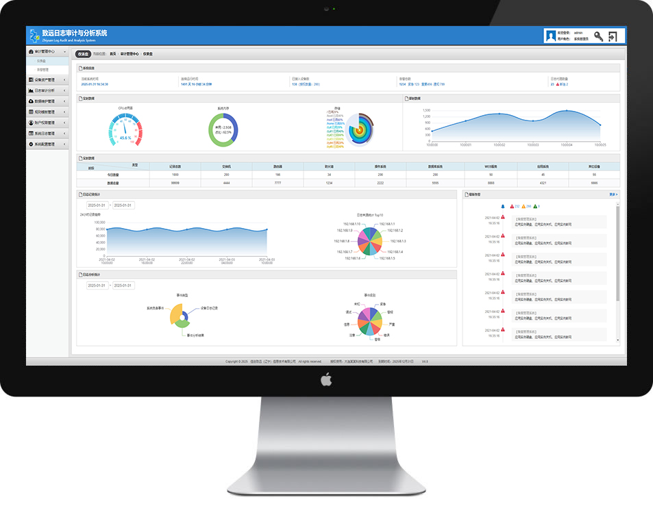支持根据事件库匹配分析以及自定义组合关联事件、数据挖掘策略,实现深入的审计分析功能。可发现各类异常日志和和行为,并触发告警、生成报表。系统仪表盘采用数据驱动图形,可直观的实时显示运行状态、系统资源、阶段统计等信息。 |