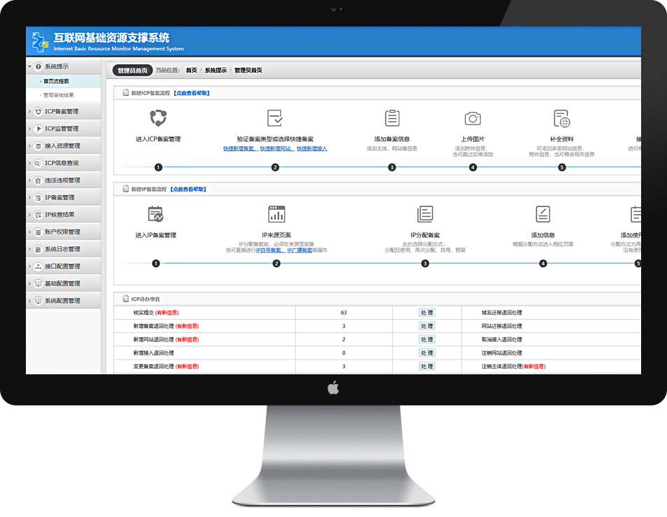 a)首页流程图:针对IP、ICP操作流程形成流程图,同时下方提醒管理员当前需要处理的备案相关工作,可点击任意一项,直接到达需要处理的项目。 b)管局审核结果:点击可以查看到管局对于已提交的备案信息审核的结果。 |