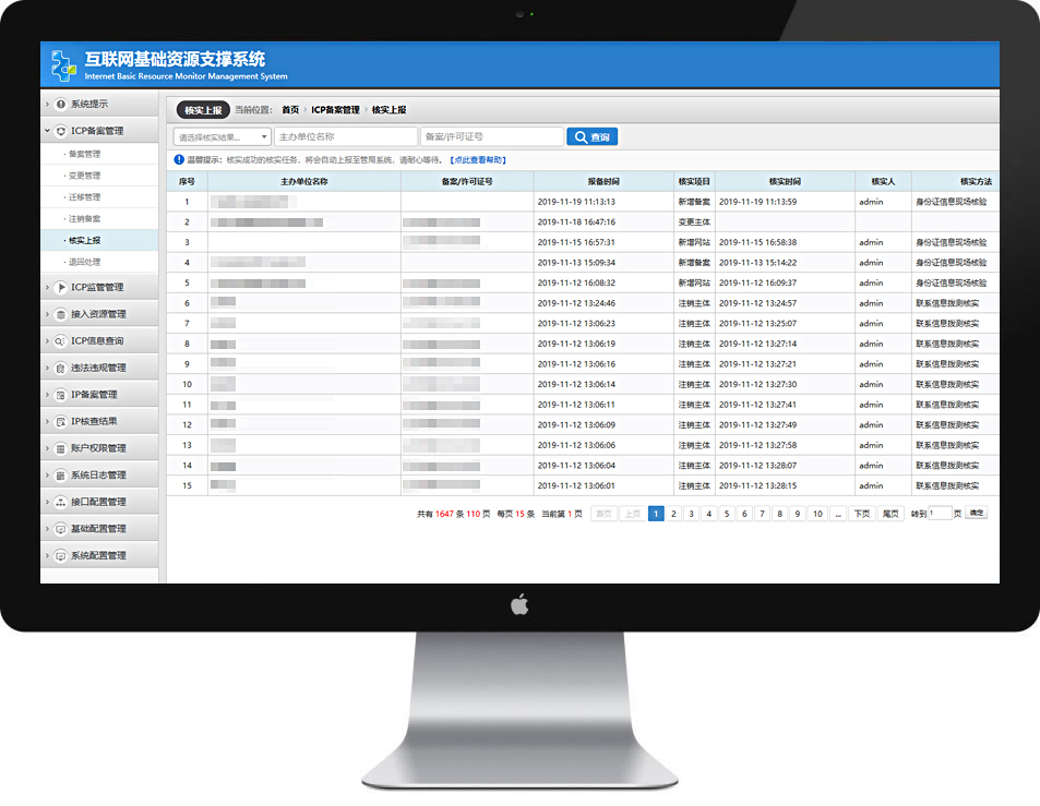 核实上报:所有的新增备案、新增网站、变更备案、注销网站信息,录入后,按照规定应当面核实用户证件、资料真实性后,须在系统内操作“核实上报”,才会把这些信息上报到至管局系统。 |