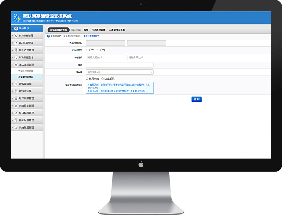 a)管局下发黑名单:某些违规的单位、个人、网站(域名)或非法接入商,会被管局列入黑名单,并下发给所有接入商,黑名单中的主体、网站和接入商将不能再备案。本系统根据管局规定,将收到的管局下发的黑名单分类显示。黑名单数据包含全国的黑名单数据,在相应表头的输入框中输入关键词,可以进行搜索。 b)未备案网站查询:功能可搜索查询出管局发现并下发的未备案网站信息,以便针对性处理。 |