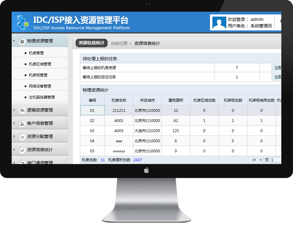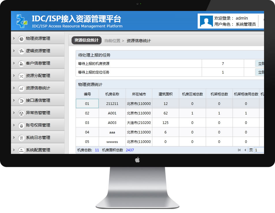a)统计本企业的IDC机房数量、机房建筑面积、每个机房的机架柜总数、每个机房的机架柜使用数、机房所在城市及相关信息; b)统计本企业的IP地址总数、IP地址使用数、虚拟主机数量及相关信息; c)统计本企业的ICP用户数量、ISP用户数量、IDC用户数量、专线用户数量、其他用户数量及相关信息。 |