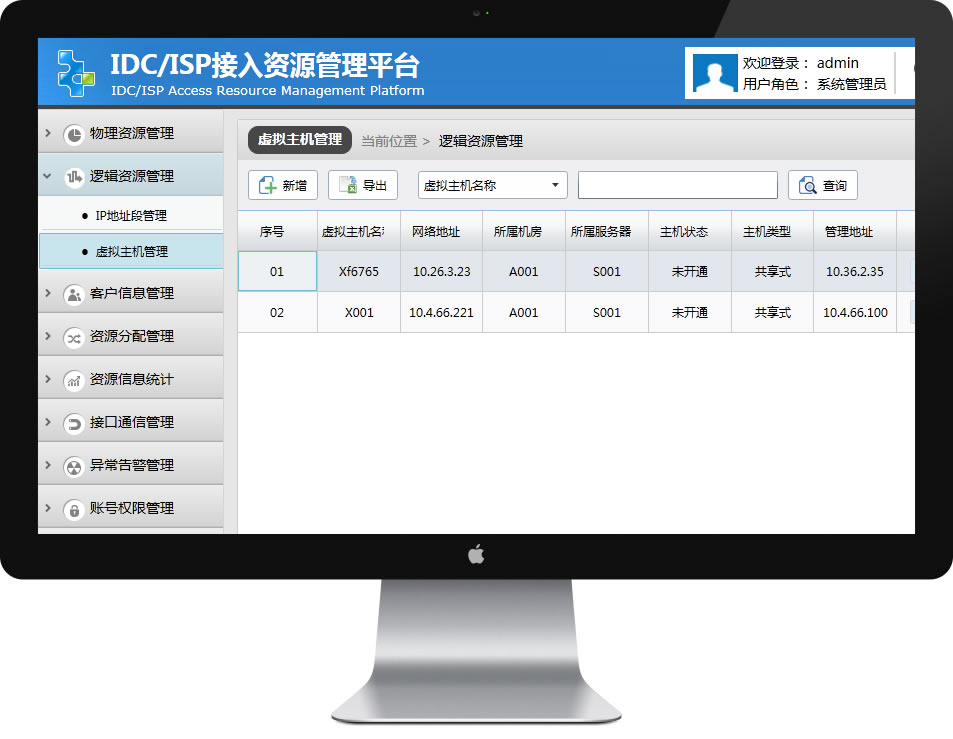 接入资源管理平台可以对逻辑资源进行管理,包括但不限于如下操作: a)对IP地址段进行新增、删除、修改、查看、预留和分配等操作。 b)对虚拟主机进行开启、关闭、新增、删除、修改和查看等操作。 |