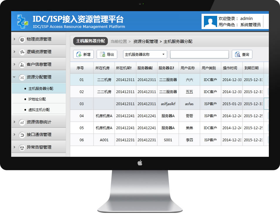 资源分配管理,可以管理您已经分配的各种资源,如机房分配,服务器分配,网络设备分配,可以点击列表查看详细的分配信息。 |