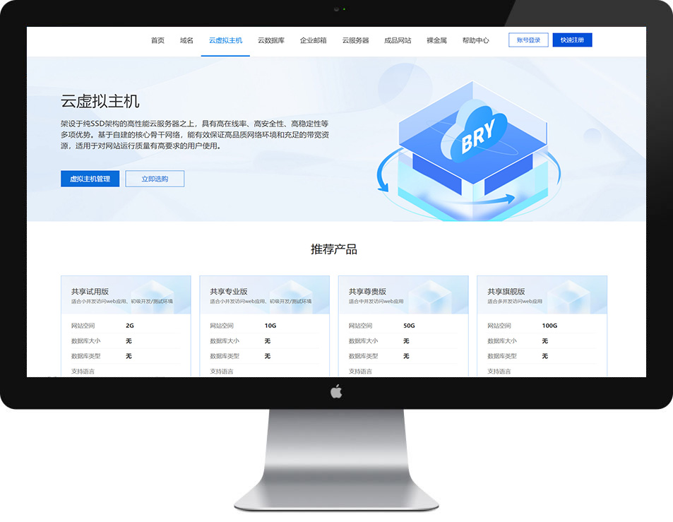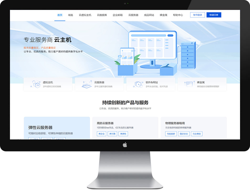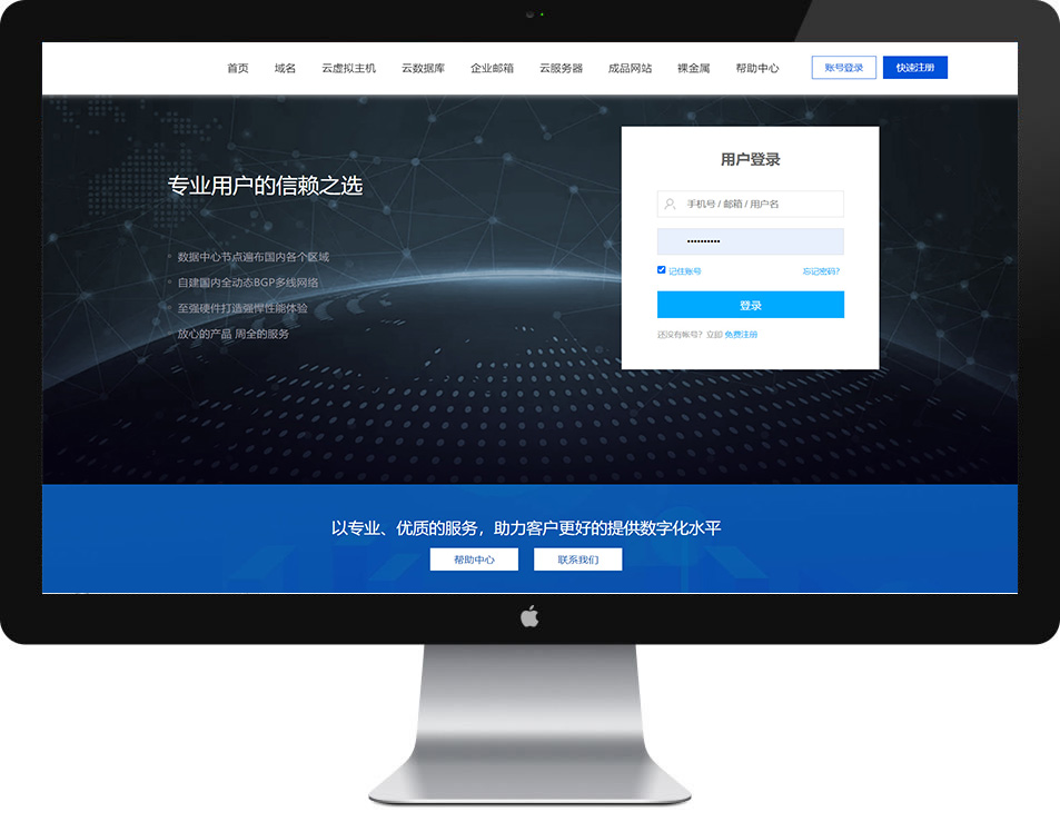 IDC业务电商前台:提供了丰富的IDC产品类目展示、用户可自行注册,下单购买、开通域名、云主机、数据库等各类IDC产品;